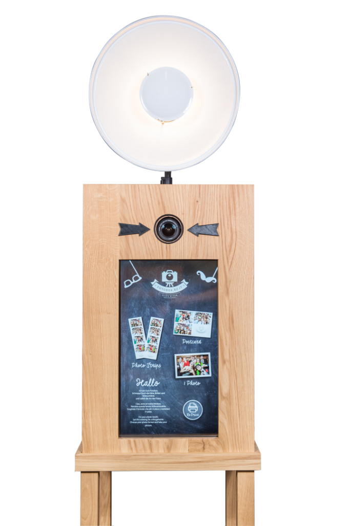 Bei der Fotobox handelt es sich um ein System, ähnlich wie bei den Passbildautomaten, welches es den Gästen ermöglicht sich selbst zu fotografieren. Dabei unterstützen der Touchscreen mit einer Bildvorschau und die verschiedenen Accessoires die Gäste beim Erstellen lustiger Bilder. Jedes Foto wird in der Box gespeichert und kann via W-Lan geteilt oder heruntergeladen werden. Die Druckvorlage kann an die Feier angepasst werden, um eine individuelle Erinnerung an das Fest zu erhalten.